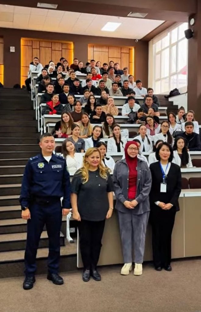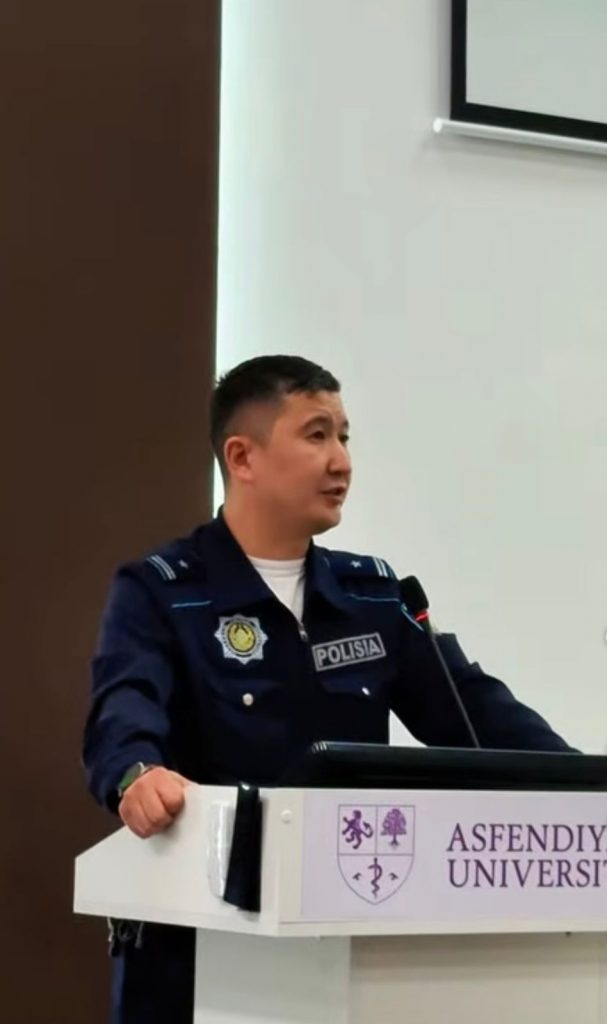 Іс-шараға Алмалы ауданы учаскелік полиция қызметкері Еркінұлы Елтай, Студенттерді дамыту және қорғау орталығының басшысы Шерзат Розметұлы , ҚазҰМУ заңгері Бегімбаева Аида ханым қатысып, 5 курс студенттері баяндама жасады. Кездесу барысында студенттерге құқықтық сауаттылық, қоғамдық тәртіпті сақтау, әкімшілік және қылмыстық жауапкершілік мәселелері түсіндірілді. Сонымен қатар, білім алушылардың құқықтары мен міндеттері, заң бұзушылықтың алдын алу жолдары талқыланды. Іс-шара студенттердің құқықтық мәдениетін арттыруға, жауапкершілік сезімін қалыптастыруға және қауіпсіз білім беру ортасын нығайтуға бағытталды.