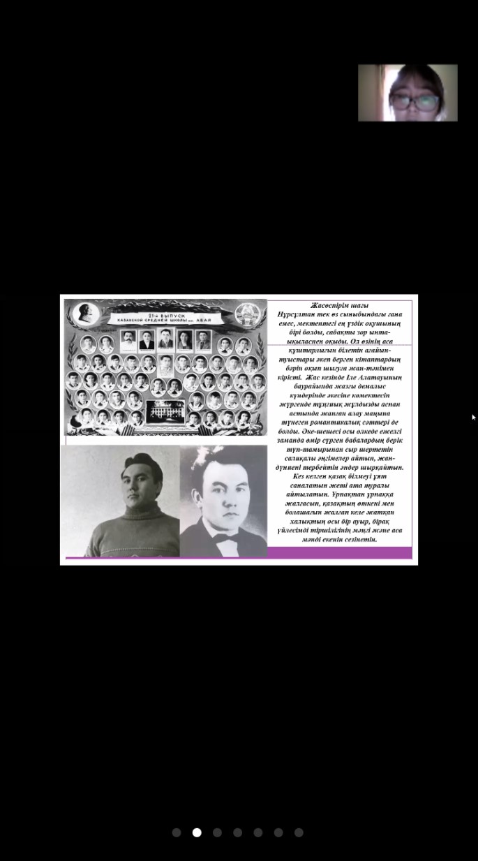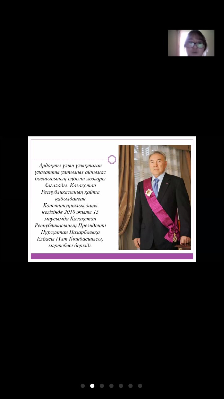 СТ18-005-02 топ студенті Ойдаш Нұржайна өзінің баяндамасында Қазақстан Республикасы тұңғыш Президентінің өмірбаян, саяси мансабы және отбасылық жайлы әңгімелеп берді.